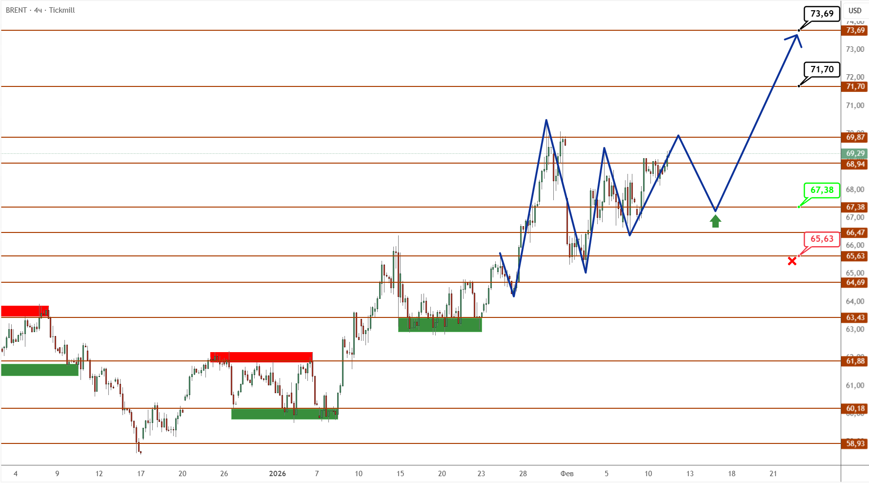 В то же время, поддержку от серьезного спада цена получает на фоне снижения морского экспорта России, а индийские НПЗ начали ограничивать заключение новых контрактов на российскую нефть, что изменило структуру глобального спроса и перераспределило закупки в пользу других поставщиков. К тому же, восходящий моментум поддерживается очередным ростом геополитической напряженности между США и Ираном. Усиление военного присутствия и риски эскалации вокруг Ормузского пролива увеличивают страховую и транзитную премию в ценах.